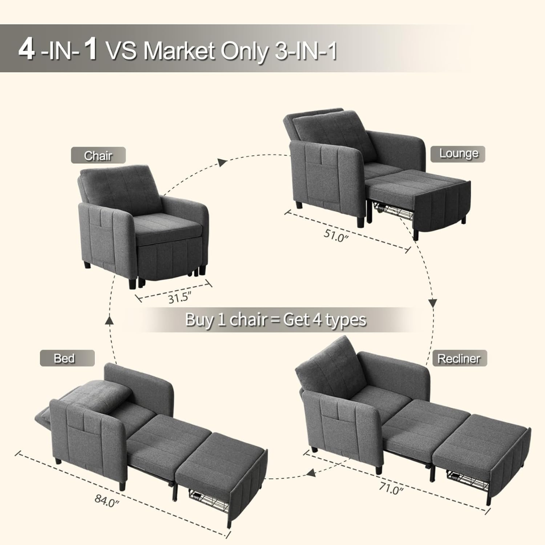 4-in-1 Functionality: Transforms into a sofa chair, recliner bed, lounge bed, or sofa bed, offering unmatched versatility for any need.